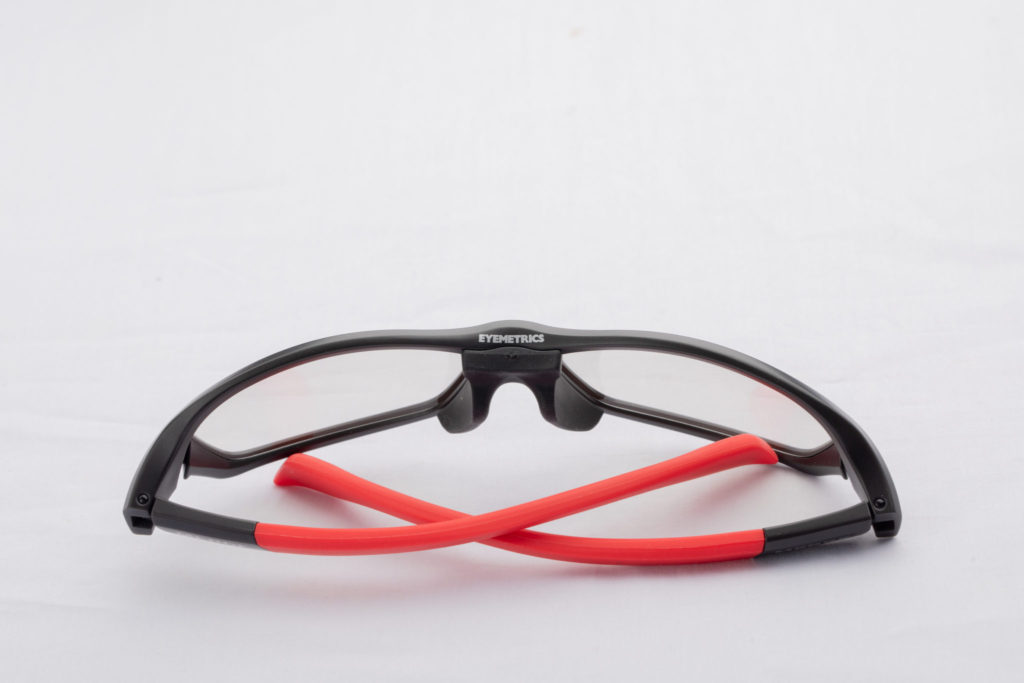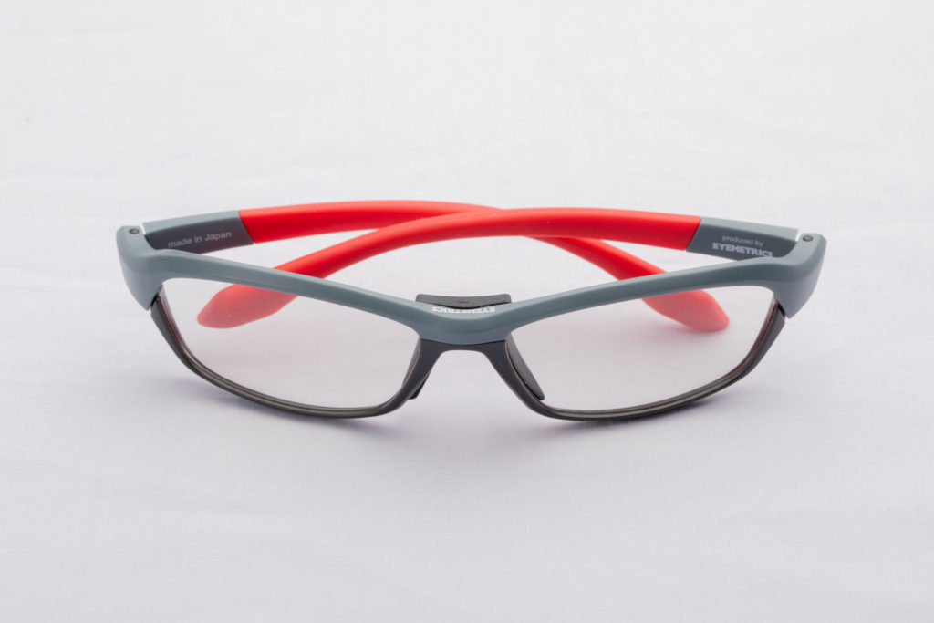 全面フレーム枠の上部がグレー・下部がブラック。左右のテンプルがレッド。