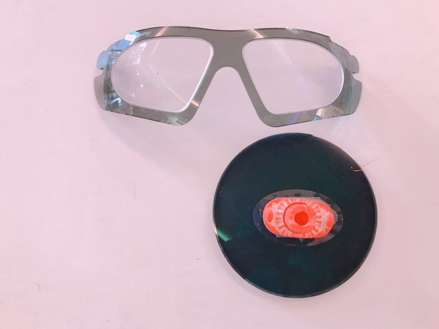今回の度付きは、くり抜き型のシールドですので、本来ならシールド使用の特殊レンズの選択とレンズ会社への加工委託をおこなうのが定石ではありますが、今回はお客様のご要望をかなえるために、自店で全てまかなう対応とさせていただきました(欠けにくい標準仕様のレンズでオーダーし、自店加工)。